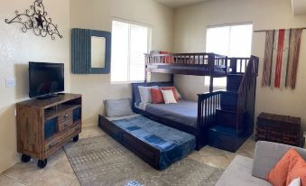 Massive master with custom jacuzzi tub, walk in shower, and walk in closets by itself on kitchen side of the house. Opposite side is the other two bedrooms with shared bath. In the middle of the home is the kitchen den and living room. The den has a high end queen sleeper, living room has a 65in tv with lots of light and custom shelving. Surround sound throughout the home and backyard.