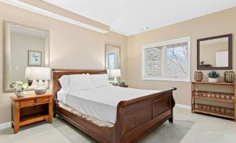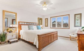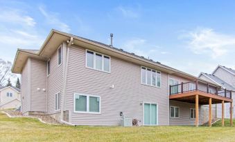 Minne-GetAway's Oak Ridge Estate is a sprawling executive ranch style home at over 3,500+ finished square feet. There is one step up from the front walk into the home at the front door and has been landscaped to feature shrubbery native to Minnesota and beautiful hydrangeas in the warmer months. This home features an astounding 6 bedrooms with 5.5 bathrooms. 3 of the bedrooms are en-suites with an attached private bathroom and walk-in closets, two are located on the main floor while the other en-suite is located in the walk-out basement level.