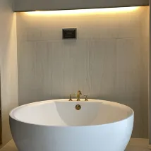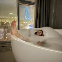 我們住在頂樓,房間視野極佳,可以欣賞到海景和城市風光——而且房間裡還有浴缸!真是美妙又浪漫的體驗。友善的工作人員也貼心地幫我們印了機票。真是太棒了!
