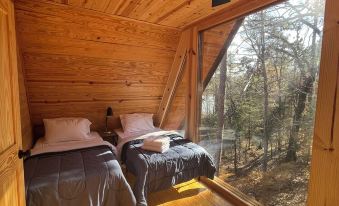 Our cabin is family vacation ready with a fully stocked kitchen and plenty of space for everyone. Two en-suite queen bedrooms, living, dining, and kitchen are on the main floor while the bunk room with four twin beds, another bath and sitting area are on the second floor. The third floor is a loft with a cozy king bed and a wonderful view of the piney woods.