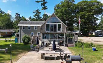 There is a gazebo for lounging with a bit of privacy, great for morning coffee and listening to the loons You can also host a ceremony on the gazebo. Extended grass area with room for all kinds of outdoor games. Volleyball. horseshoe pit, corn hole boards and polish horseshoes. Large outdoor fireplace for evening gatherings.