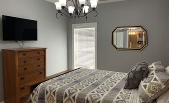 Bedroom 1 has a queen bed, bathroom, 2 night stands, a dresser, a flat screen tv and a closet.