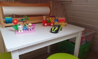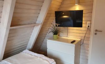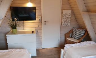 2 bedrooms upstairs with a SMART flat screen TV and a total of 4 Qualiäts beds and mattresses (can be pushed together), W-Lan / WIFI connection, wooden terrace with garden furniture and parasol, barbecue, 2 bicycles, etc.