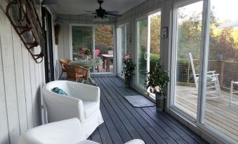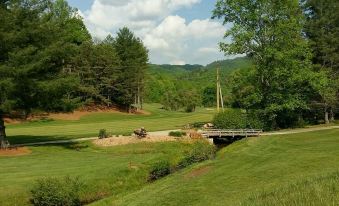 Perfect honeymoon retreat or vacation mountain escape. Incomparable sweeping panoramic MOUNTAIN VIEWS to enjoy from both your DECK and sun room areas, as well as your spacious living room, of this gorgeous Ridgecrest Mountaintop Villa. Note the elegant European Flair. Wake up to the sound of chirping songbirds, then spend your morning relaxing over breakfast in the exquisite sunroom or on your private open-air DECK. After a day of GOLFING or HIKING to spectacular area WATERFALLS or shopping for mountain crafts and antiques, light up the bar-be-que for private dining on your matchless open deck. GOLF COURSE is public and for your enjoyment. There is no better way to experience the Great Smoky Mountains of North Carolina. No restaurant can compare in ambiance to these surroundings; but if you want to treat yourselves to a night out, there are wonderful RESTAURANTS throughout the area. Just let us know what you like and we'll share our favorite places with you. If you choose to stay close to your Villa, you might enjoy morning or evening strolls throughout the valley. This villa is settled into a mountain ridge in the safe, gated GOLFING community of Mill Creek Golf and Country Club in Franklin NC near the APPALACHIAN TRAIL and the BLUE RIDGE PARKWAY. For your convenience, access to the villa is easy, paved and level. The interior is light and bright, with contemporary European styling. Master Bedroom includes a king-sized bed, and tub-shower.