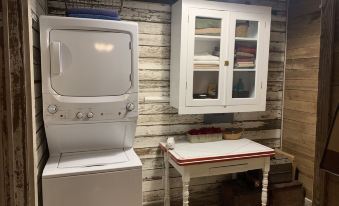 The cabin itself is full of character, built entirely from recycled wood sourced from old properties. Every detail is thoughtfully designed, from the classic farm sink to the cozy push-button gas fireplace. After a day outdoors, relax by the fire or unwind on the covered deck overlooking the river.
