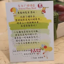 酒店在比較熱鬧的地方,生活,出行都很方便,這是前台辦理入住送的水果和卡片,果然現在是拼個性的時代,酒店也是花了點心思的,酒店客房服務效率高,打了電話送兩瓶水,掛電話的功夫,水就送到了,點贊點贊,很不錯的入住體驗,願店家生意興隆……
