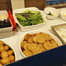 前台小姐姐們服務態度非常好,大夏天先奉上各種飲料。大堂有咖啡和檸檬水、酸梅湯供客人飲用,還有小滑梯、電動等可以讓小朋友玩。房間很乾凈,尤其是淋浴區的地磚衞生情況相當好,這點加分。晚上的宵夜有餛飩、麪條和粥,味道不錯。早餐種類不算多,但是味道和品質不錯,下次還會選擇九洲假日的。
