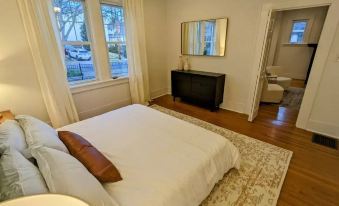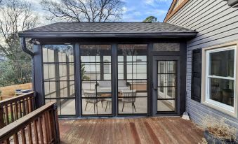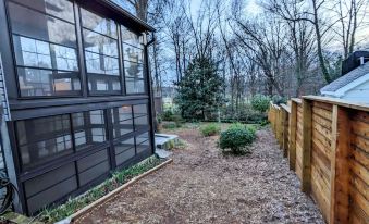 This beautiful 2 bedroom 1 bathroom home comes equipped with; 2 King Beds, 2 eating areas, a beautiful large sunporch, an updated living room space with a large smart-TV, a comfortable dedicated workspace, an updated bathroom with a walk-in shower, a new vanity with storage, a spacious kitchen with a dedicated coffee area, stackable washer and dryer, 2 large closets with hangers, & a fully fenced back yard and fenced front yard.