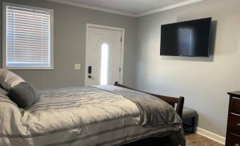 *Cozy living room with a wall-mounted, flat-screen, smart TV to entertain you. We do not offer you cable, but you can log into your Netflix, Amazon Prime, Hulu, YouTube TV, or another streaming account to keep watching. *There is unlimited high-speed fiber internet available for all these services.