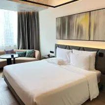 酒店位置非常好,交通便利,周圍有很多餐廳和購物中心,預訂的行政套房,下午直接去行政酒廊辦入住非常順利,考慮到親子出行,前台兩位小美女Alina Xu. Clare Deng 幫助我們申請到了房間升級,有大落地窗的套房 房間的清潔度非常高,兩位小美女還熱情地為我們介紹了酒店周邊的遊玩好去處,十分貼心, 客房設計感和配色非常喜歡,房間視野非常好,尤其是夜景,直接俯瞰車水馬龍,城市的繁華一點不影響休息,隔音性能很好。 游泳池非常乾淨有特色,早餐的選擇也非常豐富,食材新鮮,味道很好,滿足了一家三口的口味需求。 電梯的玻璃頂設計非常有特色,總的來説,這次住宿體驗非常愉快,我們一定會再次選擇這家酒店,也會推薦給朋友們。