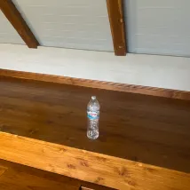 就像地板還沒打掃過一樣,到處都是沙子,還有一瓶水還沒收起來。