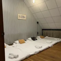 牆壁很薄,什麼聲音都聽得到,但服務不錯,而且價格便宜,睡覺的地方也不錯。蒲團是鋪在地上的2吋厚的墊子。建議疊起來睡會比較舒服!