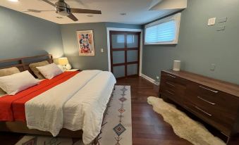 This is a three-story townhome. The ground floor has the full kitchen, living room, dining room and entryway with bikes. Access to the private patio (outdoor dining table, umbrella, sectional, lounge chairs, sunsetter, grill and smoker) is through the living room. A spiral staircase takes you up to the top floor and down to a finished basement. The top floor contains bedroom #1 (king bed), bedroom #2/office (queen sofa bed, twin bunk beds, dedicated workspace, HD TV), and a full bathroom. The finished basement contains an extra large sectional sofa that converts into a sofa bed, a projector screen and mini fridge. In-unit laundry is located within the basement in a walk-in closet.