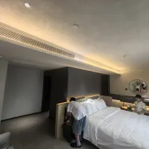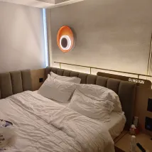 被照片騙了,兩百多的房進去就是一個通道走到頭才是床,榻榻米的,整個房間設計的很狹窄。空調電視小度操控,空調聲音巨響很影響休息,最奇葩就是他的燈的設計,正對枕頭的位置安的一顆射燈!眼睛能晃瞎(看圖5)!而且床頭的燈開關按睡眠整個房間燈全部都會熄滅包括廁所浴室,想留個燈方便起夜都不行,而且廁所燈熄了衹能在門口開也就是你又要走過通道到門口開了燈再折回中間上廁所。同樣的價位不要選這家,畢竟整棟樓好幾家酒店可以選。