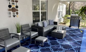 INDOOR LIVING: This spacious home features a open floor plan, high ceilings, 5 total LARGE flat-screen TVs (1 in each bedroom), the great room TV is a 70" LG Smart TV, a 10-person dining table (you can all eat together), 4-person eat-in countertop, extra breakfast table for four, two recliners for children, the great room has plenty of space for your 10 guests with a large u-sectional seating (perfect for playing games!) plus another sitting area with a couch, love seat, and 2 oversized chairs, all with modern decor.