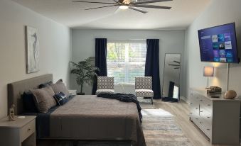 Master Bedroom 1: King Bed w Sitting Area, Large Flat screen TV, en-suite bathroom w a shower, garden tub, private toilet room and dual sinks.
