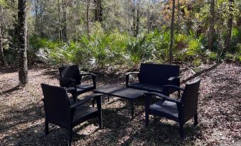 OUTDOOR LIVING: Covered patio with sectional couch, plus additional chairs and a propane BBQ grill to cook your catch of the day. There is an 8ft picnic table for dining outside. There is also a fire-pit with surrounding seating to roast your s’mores. Plus additional seating areas and a 2 person hammock to relax in under the Big Oak Trees.