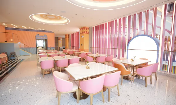 一樓大堂充滿卡通風格,運用了強烈的對比色調,還有一家小型周邊店(沒有開門),從後門可以直接進入歡樂港灣遊玩。