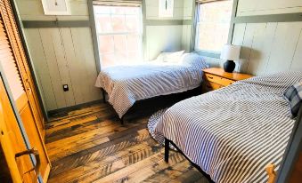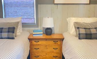 The guest room, situated on the main level, offers two twin beds, dresser, and a full-size closet.
