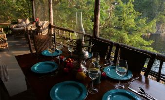 This house is seasonal and does not have heat with the exception of a cast iron woodstove in the great room and space heaters in each bedroom. In addition, we will make available our "Treetop Yurt" with a king bed, for groups that need occupancy above 8 or for an additional charge. The Yurt also has a compost outhouse and open air rain-shower, that is located high above a nearby cliff overlooking the lake which is about 200 yards from the house's front door.