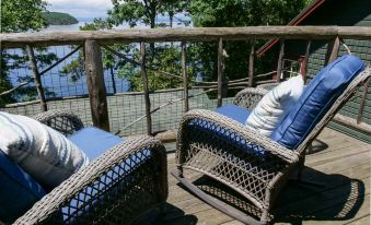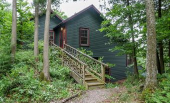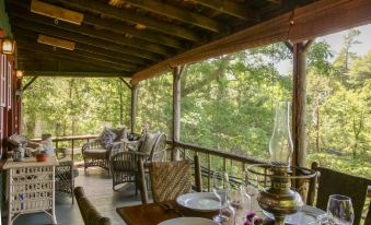 During the massive renovation, we converted the original 4-bedroom whole house into a 2-bedroom 1 bath "Main House" and then added an entire new structure, we call the "Overlook", upon the rock ledge above and slightly behind the Main House . There we added 2 huge queen bedrooms, a coffee minibar, an overdeck, and of course a bathroom with a clawfoot tub & shower. The two structures are connected by an switchback staircase that is internal to the Main House but connects via an open deck to the Overlook. There is a floorplan in the photos.