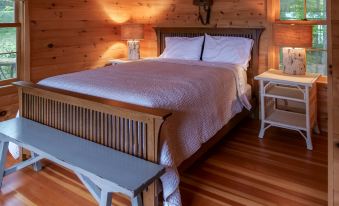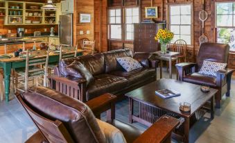 The Main House includes a primary queen bedroom, that has a private outside terrace, and an adjacent kids bunk bed room that are both down the hall from the living room and modern kitchen. The kitchen is quite large and has an oversized fridge, gas oven and range on the island, as well as a farmhouse sink with tons of cookware. The living room is appointed with thick leather Stickley sofa and lounge chairs that face the Vermont Castings wood stove which is perfect for warming up the house in the mornings or at night while you play one of our large selection of unique and classic board games with your family. We have two dining room tables, one inside and the other outside in the screen porch; each of which double as terrific places to gather. The living area and kitchen has 14 large double-hung windows around three sides of the room that create amazing breezes throughout the days and nights. There is a downstairs bathroom located across the hall from the bedrooms that includes a slate-wall rain-shower room made for company.