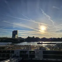 樓下就是車站,每天去展館做電車,衹要十幾分鍾,步行到教堂也很近。酒店早餐是很豐富,但是吃不慣白人飯。餐廳下樓就是個橋,可以橋上看到萊茵河,景色還是很棒的。