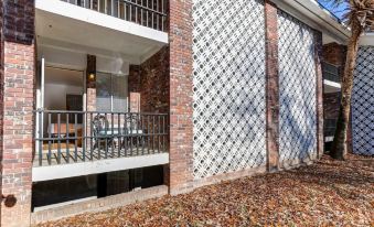With curated vintage touches and a dusty rainbow palette inspired by the '60s to call back to the building's age, this studio apartment is quirky and fun. Original details, like the patterned breeze block, hardwood floors, hexagon tile bathroom floor, and bedroom ballast were preserved to maintain the studio apartment's midcentury charm. The cozy private balcony features seating to enjoy the lovely South Carolina weather.