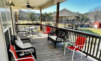 Bring your own toobs or rent next door at Caps Toob Rentals. Caps will provide a shuttle back from Lone Star Float House or Second Crossing Bridge which provides a perfect afternoon float trip. In front of the house at the beach is a deeper natural swimming hole. The view from the patio is gorgeous and you may even spot goats at breath taking heights in the mornings along the cliffs across the river.. A large area under the house is the perfect for family gatherings to sit out of the summer heat or to toss washers/cornhole. The beach is private as you are in a gated community with other vacation renters.