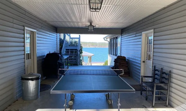 While the house(s) provide much comfort, you are likely here to play on the lake and outside. Access will be provided to the garage with the boat ramp, although it is recommended that larger boats be launched at Parker Creek marina, which is located nearby. Paddles for the kayaks and life vests can also be found in the boat ramp garage. The lighted dock has covered and uncovered spaces. The covered space is stationary, and the remainder is floating. The dock provides amazing views of the sunset at the end of the day. The water depth is ~7 feet at full pool at the end of the floating dock. There is also a SeaDoo port that can be used. On land there is a firepit surrounded by 6 adirondack chairs and complimentary firewood is provided. In the dogtrot, there is an outdoor sink, picnic table, propane grill, ping pong table and cornhole boards. Under the deck are 6 kayaks that are available for use. Last and of course, hi-speed Internet and Wi-Fi are also provided.
