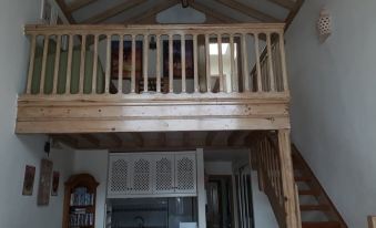 The first floor consists of a mezzanine area with double sofa bed and ceiling fan. This leads to the second bathroom which has a toilet and shower. There is a mirrored vanity area outside the bathroom with a double wash basin and hairdryer.