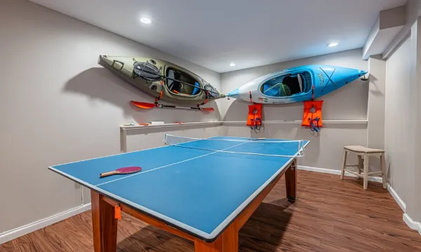 Wanting to have some fun? Head down to the basement for some friendly competition with our ping pong table, arcade machine or shuffle board. There’s a nice couch set down there with a large screen TV and wood burning stove for those cold winter nights! Theres a stereo down there for all the music lovers. There’s a half bathroom located in the basement. On the warmer days, there’s access to the backyard from the basement leading out to a nice fire pit surrounded by beautiful nature!