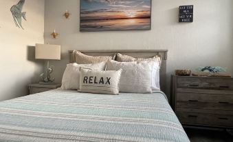 Queen Size Bed, (can add a twin portable bed or portable crib by request only for 1 more person if needed), microwave, minifridge, coffee maker, linens, towels, 55" SmartTV 140+channels+Netflix, beach chairs, towels and umbrella are provided.