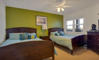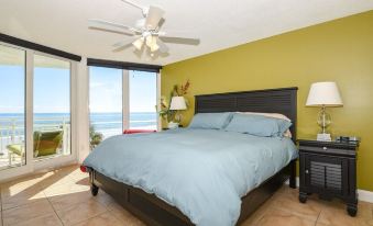 該公寓有一個大主臥,配有一張特大號床和通往陽台的滑動玻璃門。透過玻璃門和大窗戶,您可以躺在床上欣賞到美麗的海景。(您會感覺海浪湧上床。)有一個帶梳妝區和大衣櫃的私人主衛生間。主臥室配有高清平板電視。一間客房配有一張特大號床和平板電視。第二間客房配有兩張大號床和平板電視。每間客房都有私人全套衛浴。每間臥室都有自己的衣櫃。雖然客房位於公寓的前側,但從窗戶可以看到內陸水道的景色。