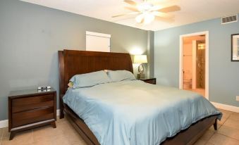 The Condominium has a large master bedroom with a king-size bed and sliding glass doors that access the balcony. With the glass doors and the large windows you have a great view of the ocean while lying in bed. (You will feel like the ocean waves come up to your bed.) There is a private master bathroom with a vanity area and a huge closet. The master bedroom has a HD flat screen TV. One guest bedroom has a king-size bed with a flat screen TV. The second guest bedroom has two queen-size beds along with a flat screen TV. There are private full baths for each of the guest bedrooms. Each bedroom has its own closet. And although the guest bedrooms are on the front side of the unit, there is a view of the Intracoastal waterway out their windows.