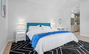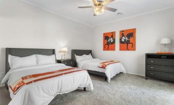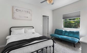 Each room is thoughtfully designed with vintage artwork and color palettes inspired by iconic fashion houses like Dior, Chanel, Hermes, and Tiffany. The master suite features a plush king bed, while the second master offers two full-sized beds. Two additional rooms provide ample sleeping space with a full-sized bed, a futon, and two full-sized bunk beds.