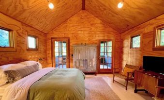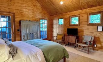 Upstairs in the main house is the spacious primary suite featuring a vaulted ceiling, built-in wardrobe and comfortable queen bed. This bedroom also has an en-suite full bathroom and a fully screened-in outdoor porch with a gas fireplace. It's the perfect escape year round.
