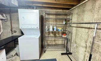Upon entering the guest cottage, you'll find the den on the first floor, which has a sofabed, desk and TV. Upstairs is an open bedroom with a full-sized bed and full bathroom. In the basement of the guest cottage, you'll find the laundry room.