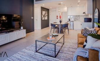步入起居區,陽光透過落地玻璃牆和玻璃門傾瀉而入,讓您倍感溫馨舒適。您可以舒適地坐在舒適的灰色沙發和躺椅上,欣賞大屏幕平板電視上您喜愛的節目,茶几、地毯、鏡子和藝術畫作讓起居區更加完美!您可以與家人朋友一起在華麗的圓形木桌旁用餐,餐桌上配有四把不同顏色的現代軟墊餐椅,這讓起居區獨具特色。想試試您的廚藝嗎?別擔心,我們會幫您。開放式廚房設施齊全,爐灶、抽油煙機、微波爐、烤箱、水壺、咖啡機、烤麵包機、洗衣機、水槽、冰箱和現代化的廚櫃等一應俱全。體驗最精緻的臥室,配備特大床、超軟床墊、飯店品質的床單和枕頭,確保您擁有良好的睡眠。房間內鋪有柔軟的地毯,配有帶燈的床頭櫃、帶鏡子的梳妝檯、內置衣櫃和獨立浴室。與您的伴侶在配有戶外傢俱的陽台上,一邊品嚐早晨的咖啡或晚上的茶,一邊放鬆身心。關於寵物:不允許攜帶寵物。關於退房:上午 11:00 之前退房。關於孩童:允許攜帶孩童:0-17 歲。關於入住:下午 4:00 後入住。關於吸菸:禁止吸菸。關於活動:不允許舉辦活動。