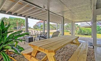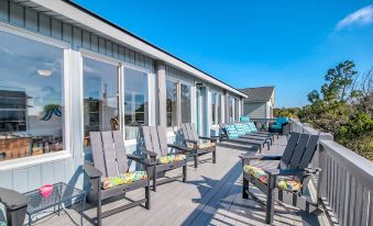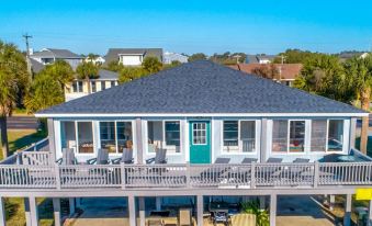 This floorplan was perfect for our extended family of 9 adults plus 3 dogs. Two bedrooms on either side of the house and the barn doors separating the bedrooms/bathroom from the main area gave privacy. Enough room for everyone. Huge kitchen counter with dinner table for 6 and lots of extra barstools. Well stocked kitchen. Amazing sunroom and sun deck with plenty of lounge chairs, adirondack chairs and tables facing the ocean. Fun games. Fenced backyard and gates on porches ensure pets or little ones don't escape. Walkway to beach very close. Quiet street. Host responds immediatley. Older but well maintained and furnished house. We really enjoyed our stay. Just needs a swing underneath. We will stay here again!