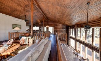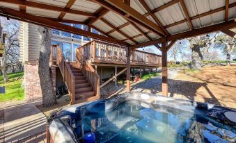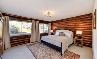Surrounded by acres of oak trees, this Log Cottage is a hidden gem that you don't want to miss out on! The interior is beautifully decorated to help any group relax and enjoy their time together. The first floor has original, custom brick floors that lead you from a cozy sitting area with amazing views to a pool table, skee ball table and all your bedrooms downstairs. The master bedroom has a king size bed and its own elegant, private bathroom. The other two bedrooms are also designed for comfort, one with a king bed and the other with a queen bed. The second bathroom and a laundry room are also on the first floor.