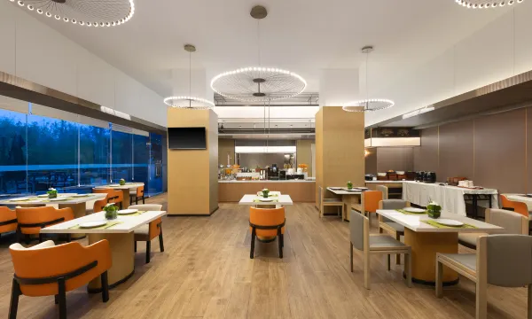 飯店配有室內餐廳,提供中西式營養早餐,同時擁有一個臨湖露天風情餐廳,清晨,迎霞光萬丈;日間,觀碧水雲天;黃昏,看夕陽西下;夜晚,賞燈火闌珊。