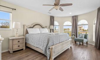 • Master 1: King bed, attached bath with walk-in shower, and pool/pond/river views