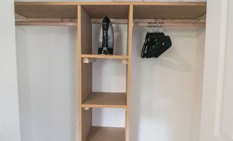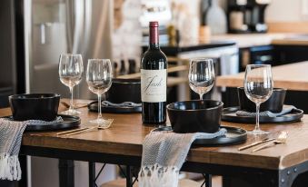 You will find a brand new stackable washer and dryer with a starter bottle of detergent and fabric softener. Each bathroom also comes with a set of H20 Therapy Shampoo, Conditioner, Body Wash, Body Lotion and bar soap.