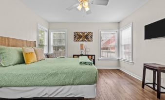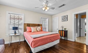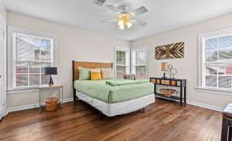 The main house is a 1300 sq ft. charming 2 bedroom with a shared en-suite 1 bathroom. The bedrooms are largely sized with Plush-top Queen Beds, fresh white linens, TVs, and walk in closets.