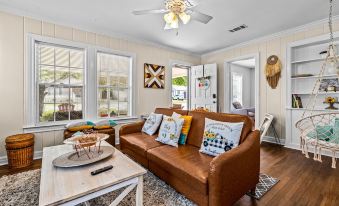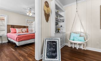 Living area provides a unique couch that turns into a sofa bed, sitting areas, a serene reading nook accessorized with a charging station and a cute hanging boho chair to relax or catch up on your favorite shows.