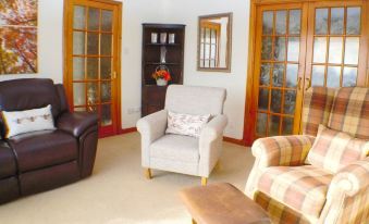 The living room has a 2 seat recliner sofa and two armchairs with footstools. The dining room has an extendable table with ample room for 4 guests.