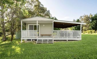 You have full access to your own cabin. The cabin has covered parking and veranda with daybed and seating. Inside you’ll find an open plan living dining and kitchen. The bedroom and bathroom are separate to the main living areas.