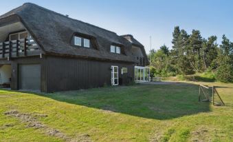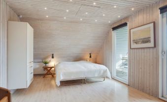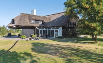 Single-family house, built in 1972. 3.5 km from the sea. Private: natural state property 10'000 m2, indoor pool (3 x 6 m, 18 m2, depth 150 - 150 cm). Terrace (200 m2), children's playground (swing). In the house: sauna, table football, washing machine, tumble dryer. Parking at the house. Carport. E-charging station. Grocery 5 km. Golf course 14 km. The owner does not accept any youth groups. "Gertrudis" - 2km to the fjord", 6-room house 420 m2. Object suitable for 12 adults + 2 children. Living room with open-hearth fireplace and TV. 1 room with 1 double bed. Kitchen (oven, dishwasher, 5 ceramic glass hob hotplates, microwave, freezer). 5 showers/WC. Upper floor: 1 room with 1 double bed. 1 room with 1 x 2 bunk beds. 1 room with 1 double bed. 1 room with 2 beds. 1 room with 1 double bed. Terrace 40 m2, roofed. Facilities: children's high chair, baby cot. Internet (WiFi). Please note: non-smokers only. Maximum 1 pet/ dog allowed. 787-173753