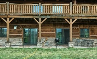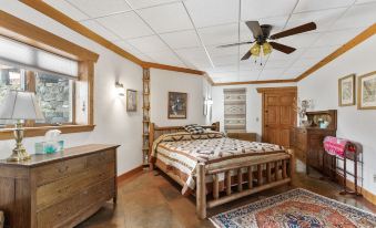The WEST CONDO, with ~ 1150sf, has 2 bedrooms with private baths. The Sportsman Bedroom has a queen sized Mission-style bed with tub/shower in the bath. The Yellowstone Bedroom has a king sized log bed with handicapped accessible walk-in shower in the bath. As a special addition, the Great Room has an electric stove for heat and ambiance.